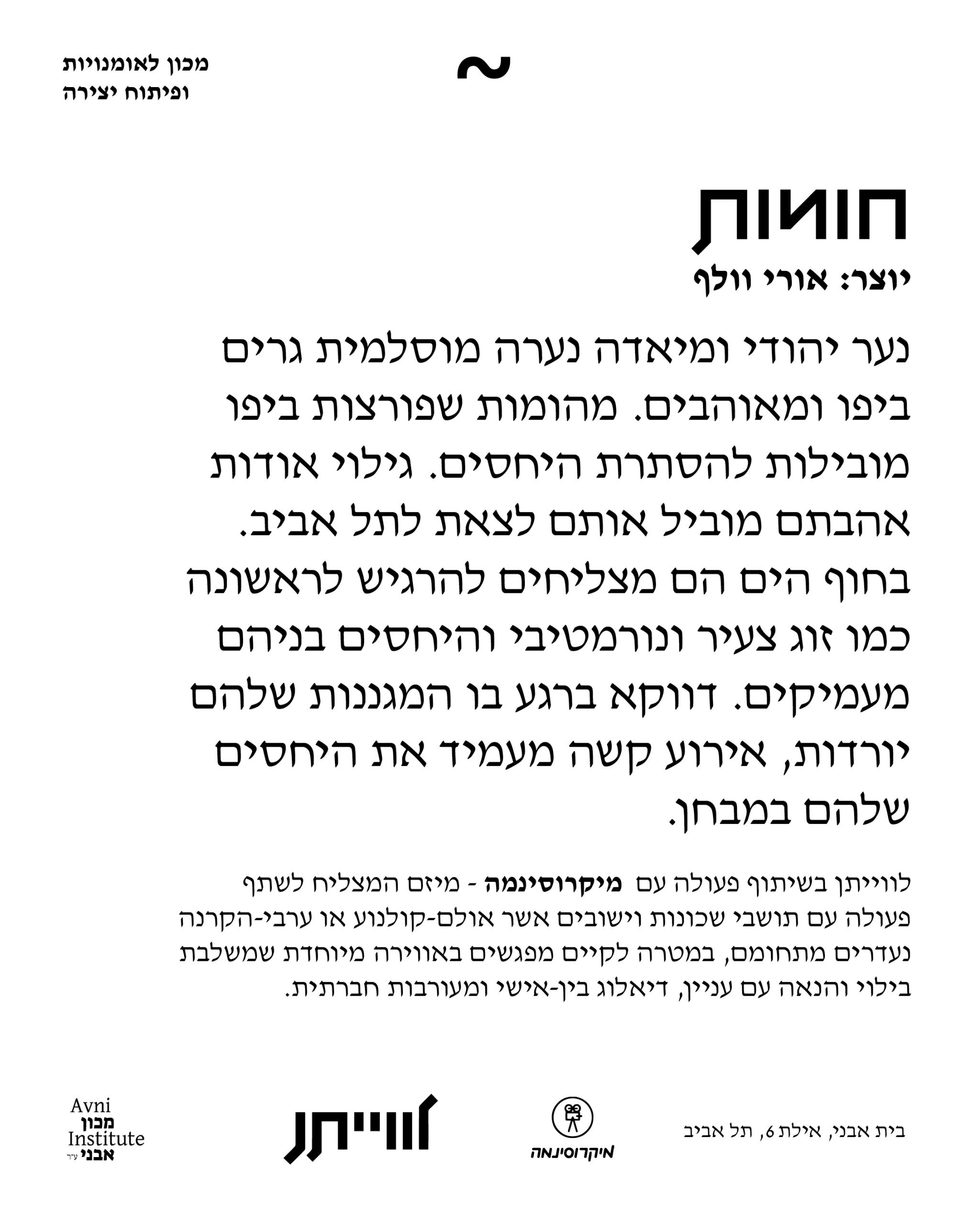 באחד משיתופי הפעולה שלנו אנחנו מארחים את מיקרוסינמה – סרט לשם שינוי, פרוייקט מעורר השראה רב-שכונתי המגיש צפייה בקולנוע מקומי איכותי ושיחה מרתקת עם היוצרים והיוצרות. כמחווה למקום שאנחנו, התחלנו בסדרה של סרטי סטודנטים קצרים נבחרים.